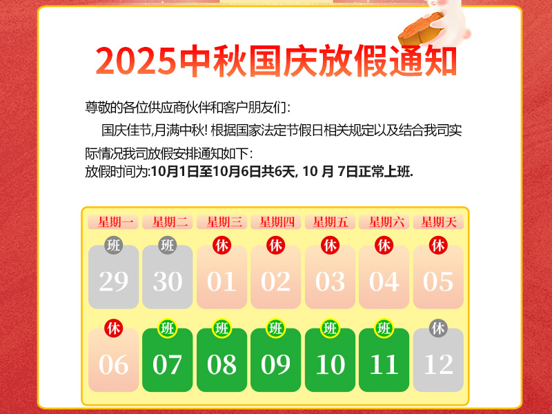 尊敬的各位供應商伙伴和客戶朋友們:國慶佳節(jié),月滿中秋!國慶家園月圓人團園,國慶中秋雙節(jié)共歡騰!在此預祝大家度過一個輕松、愉快的假期.根據國家法定節(jié)假日相關規(guī)定,再結合我司實際情況,現將2025年國慶中秋節(jié)放假安排通知如下:放假時間定為10月1日至10月6日(星期三至星期一),共計6天.2025年 10月 7日(星期二)正式上班,假日期間如有業務需求可電話咨詢業務,感謝大家的理解與配合!秋高氣爽迎中